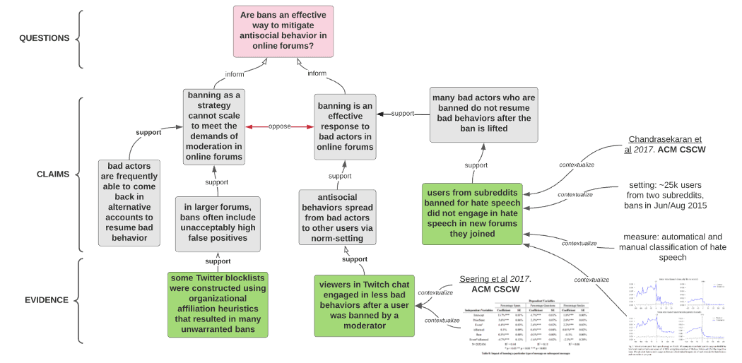 To give an intuition for what it is, here is a figure of a visual representation of a simple Discourse Graph for a body of literature on bans and antisocial behavior in online forums. You may recognize similarities to things like argument maps.